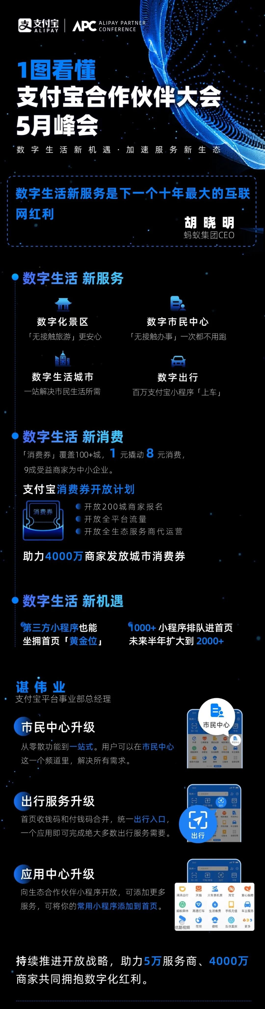 520大会蚂蚁金服CEO胡晓明说“未来支付宝持续向大家开放中心化的流量、运营的能力,接下来我们想向服务商持续开放能力,助力直联、间联、代运营、saas服务商等各类合作伙伴加速成长。